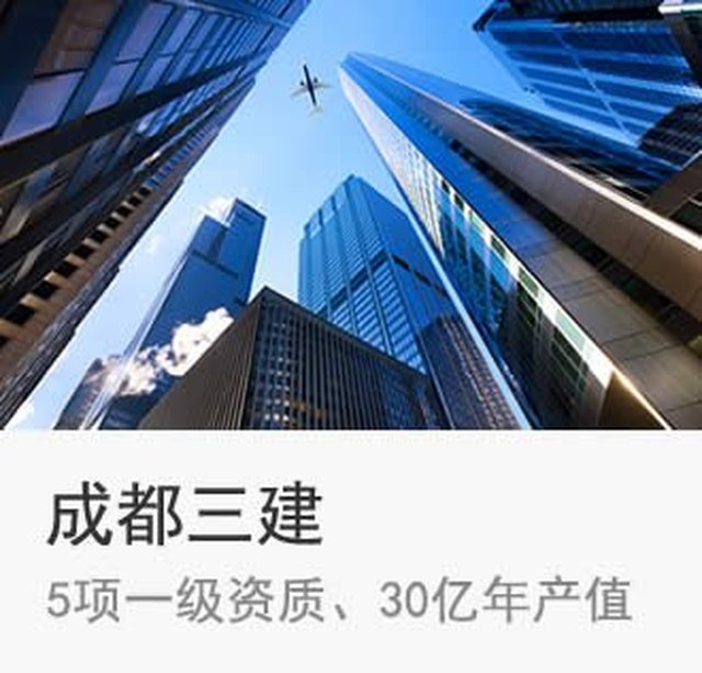 成都市第三建筑工程公司(简称“成都三建”),隶属于成都市建筑工程集团总公司。公司始建于1965年,迄今为止总资产已达22亿元,年产值逾30亿元,现已取得ISO9001:2008质量管理、ISO14001:2004环境管理和GB/T28001-2001职业健康安全管理三体系认证,并具有房屋建筑工程施工总承包一级、市政公用工程施工总承包一级、公路工程施工总承包二级、地基与基础工程专业承包一级、建筑装修装饰工程专业承包一级、机电设备安装工程专业承包一级、附着升降脚手架专业承包二级、钢结构工程专业承包二级、消防设施工程专业承包二级资质,各项经济技术指标均达到省、市建筑行业先进水平。